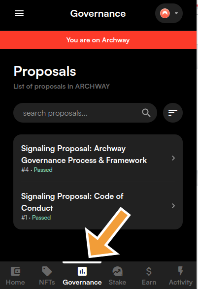 First, make sure to set up the Leap wallet and select Archway: Then, go to the Governance section: