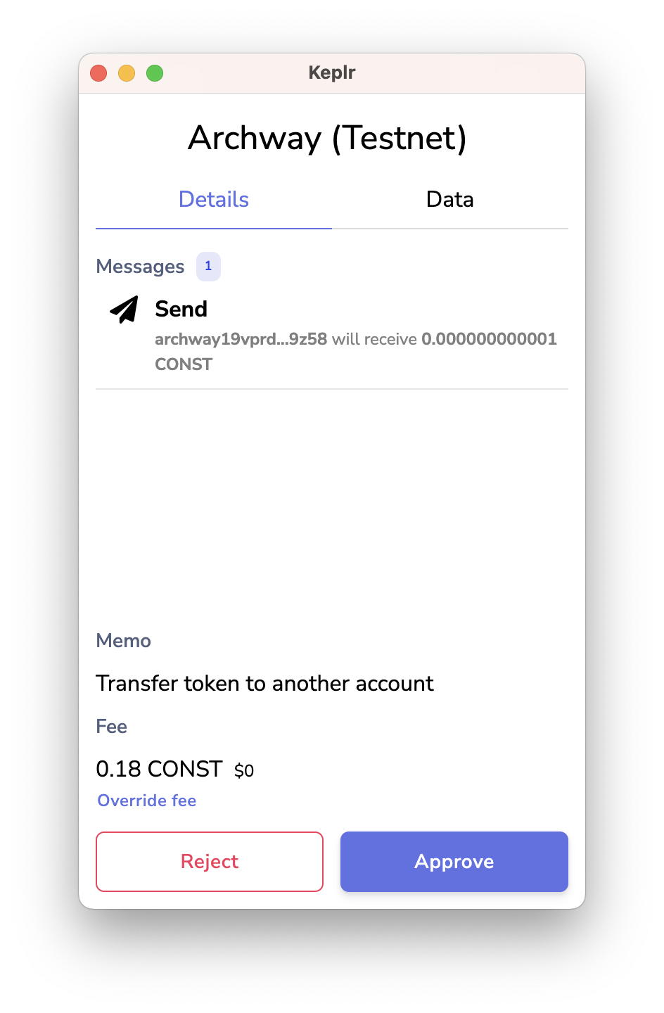 window.keplr.defaultOptions = { sign: { preferNoSetFee: true, }}The following is a screenshot of how the Interactive Option displays the fee within the Keplr window. While the frontend sets the default fee, users still have the choice to override the fee if desired: