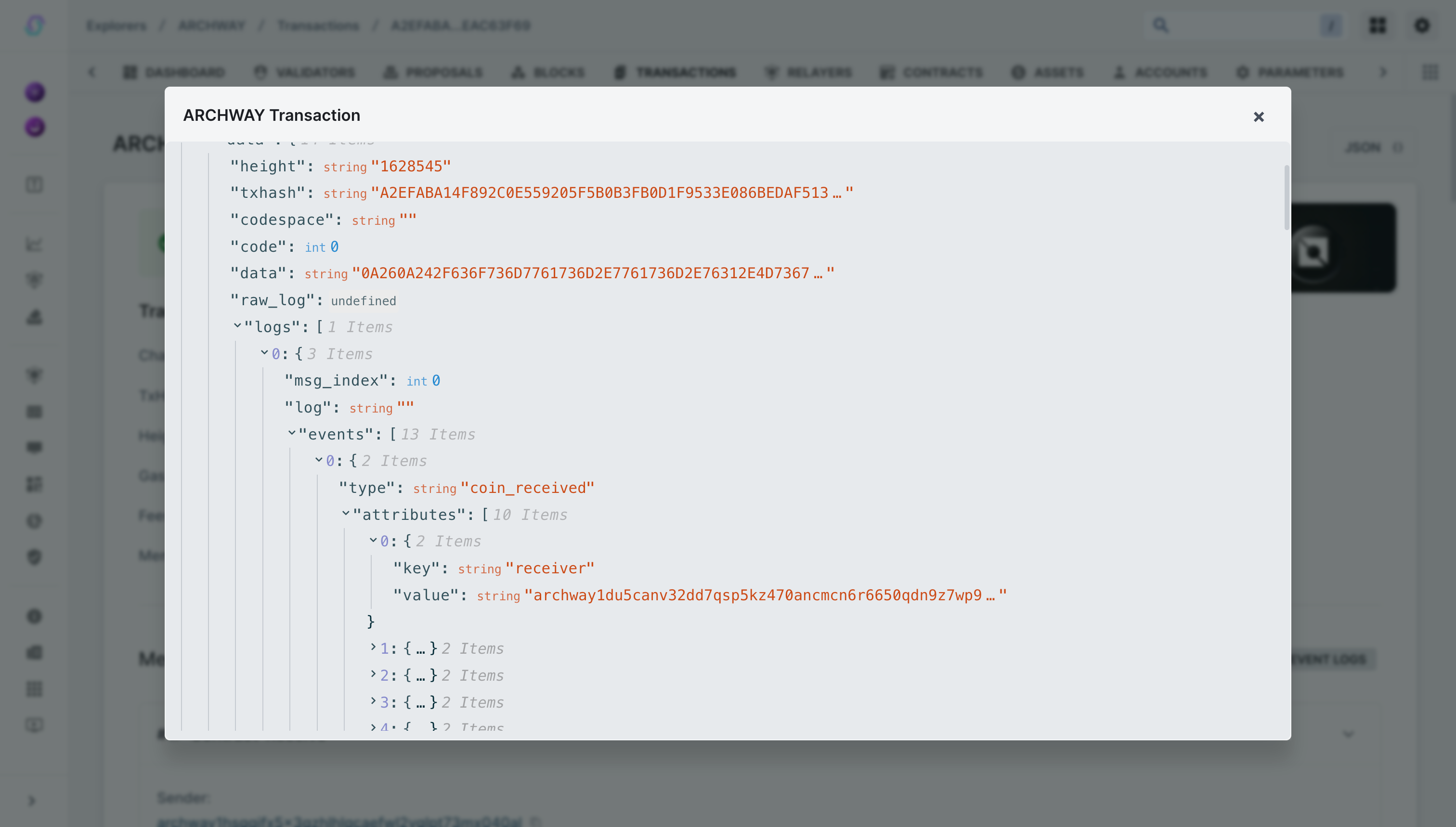 // Import the WebSocket library for real-time bidirectional communication.const WebSocket = require('ws');// Import the UUID library to generate a unique ID for each subscription request.const { v4: uuidv4 } = require('uuid');// Define the address that is checked in the transactions.const address = 'archway1cc0kxd3y4670mzhgz5j34s5euzppwhgp4cljjc';// Initialize websocket and wsQuery variables.let websocket;let wsQuery;// This function initiates a WebSocket connection and sends a subscription request to track transactions that fulfill certain conditions.const queryForBalanceUpdate = () => { try { // Open a new WebSocket connection to the specified URL. websocket = new WebSocket('wss://rpc.constantine.archway.tech:443/websocket'); // Define the subscription request. It asks for transactions where the recipient address, and checks for transactions to be published. wsQuery = { jsonrpc: '2.0', method: 'subscribe', id: uuidv4().toString(), params: { query: `tm.event = 'Tx' AND transfer.recipient CONTAINS '${address}'`, }, }; // When the WebSocket connection is established, send the subscription request. websocket.on('open', () => { websocket.send(JSON.stringify(wsQuery)); }); // When a message (i.e., a matching transaction) is received, log the transaction and close the WebSocket connection. websocket.on('message', (event) => { const eventData = JSON.parse(event); if (eventData && eventData.result && eventData.result.data) { console.log('Matching transaction found' + JSON.stringify(eventData.result.data)); disconnectFromWebsocket(); } }); // If an error occurs with the WebSocket, log the error and close the WebSocket connection. websocket.on('error', (error) => { console.error(error); disconnectFromWebsocket(); }); } catch (err) { // If an error occurs when trying to connect or subscribe, log the error and close the WebSocket connection. console.error(err); disconnectFromWebsocket(); }};// This function closes the WebSocket connection and resets the websocket and wsQuery variables.const disconnectFromWebsocket = () => { // If the WebSocket isn't open, exit the function. if (!websocket || websocket.readyState !== WebSocket.OPEN) return; // Send an 'unsubscribe' message to the server. websocket.send(JSON.stringify({ ...wsQuery, method: 'unsubscribe' })); // Close the WebSocket connection. websocket.close(); // Reset the websocket and wsQuery variables. websocket = null; wsQuery = null;};// When the process is exiting, close the WebSocket connection if it's still open.process.on('exit', () => { disconnectFromWebsocket();});// Start the process by calling the queryForBalanceUpdate function.queryForBalanceUpdate();The above code sets up a WebSocket client to connect to a Tendermint RPC server and subscribes to transaction events. We are using the @cosmjs/tendermint-rpc package to interact with the Archway network via WebSocket, and the code outputs the details of transactions as soon as they occur as a JSON.