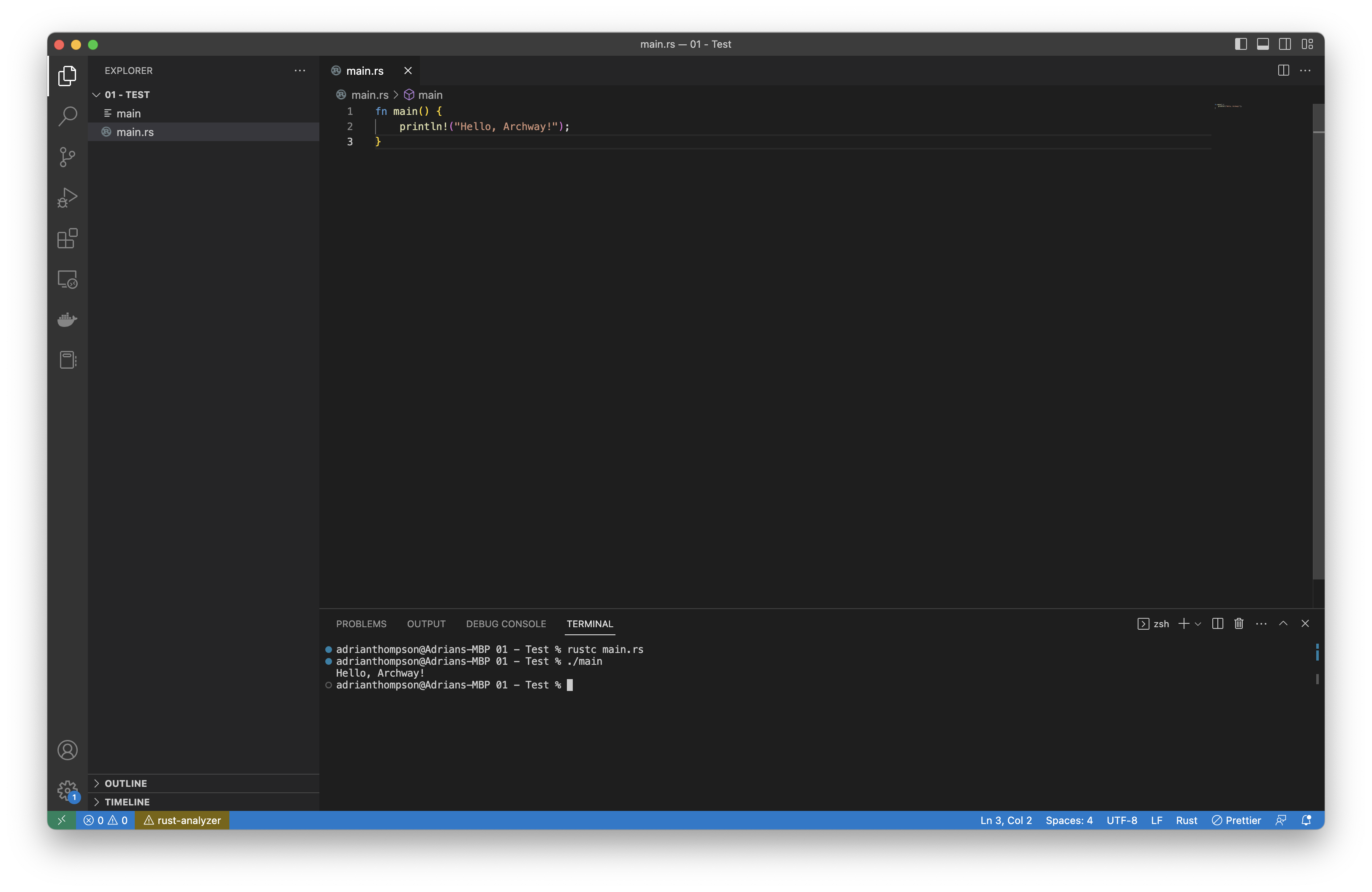 fn main() { println!("Hello, Archway!");}Launch a terminal within VS Code by going to Terminal -> New Terminal and execute the following command to compile the program: