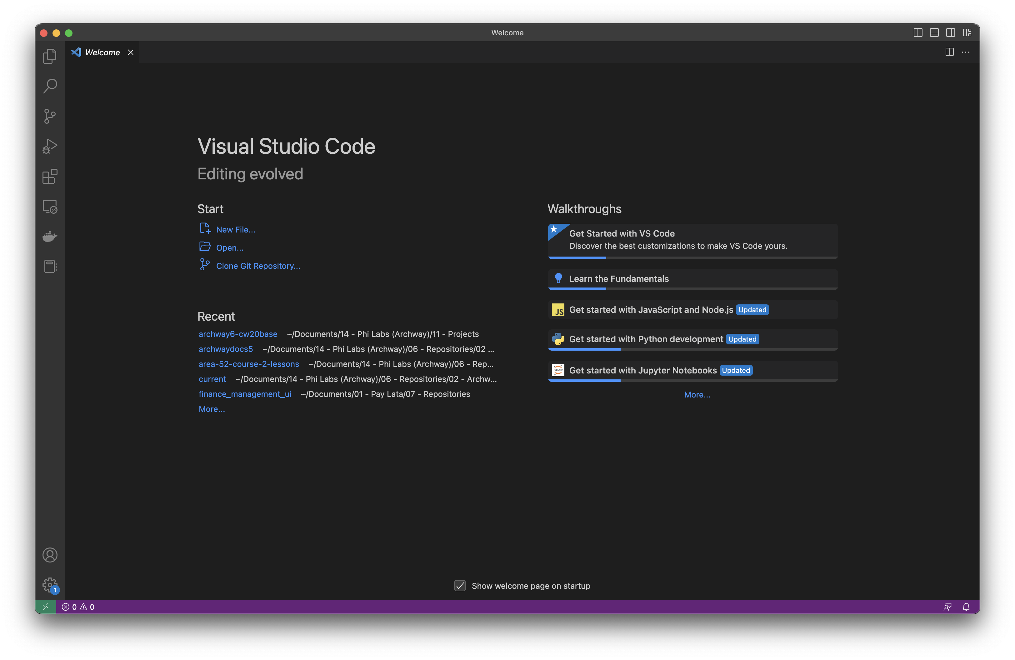 - Open VS Code from the Applications folder, by double-clicking the icon.