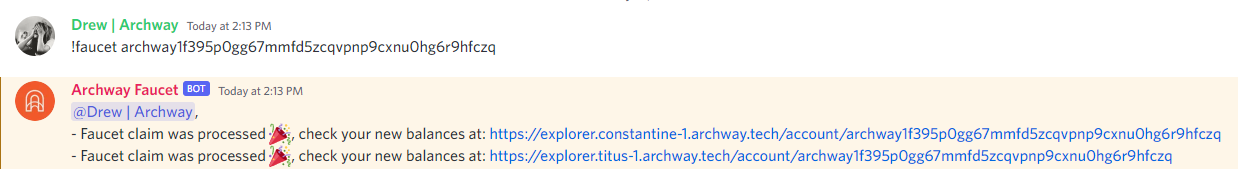 - Send the following message in the 🚰 | faucet channel