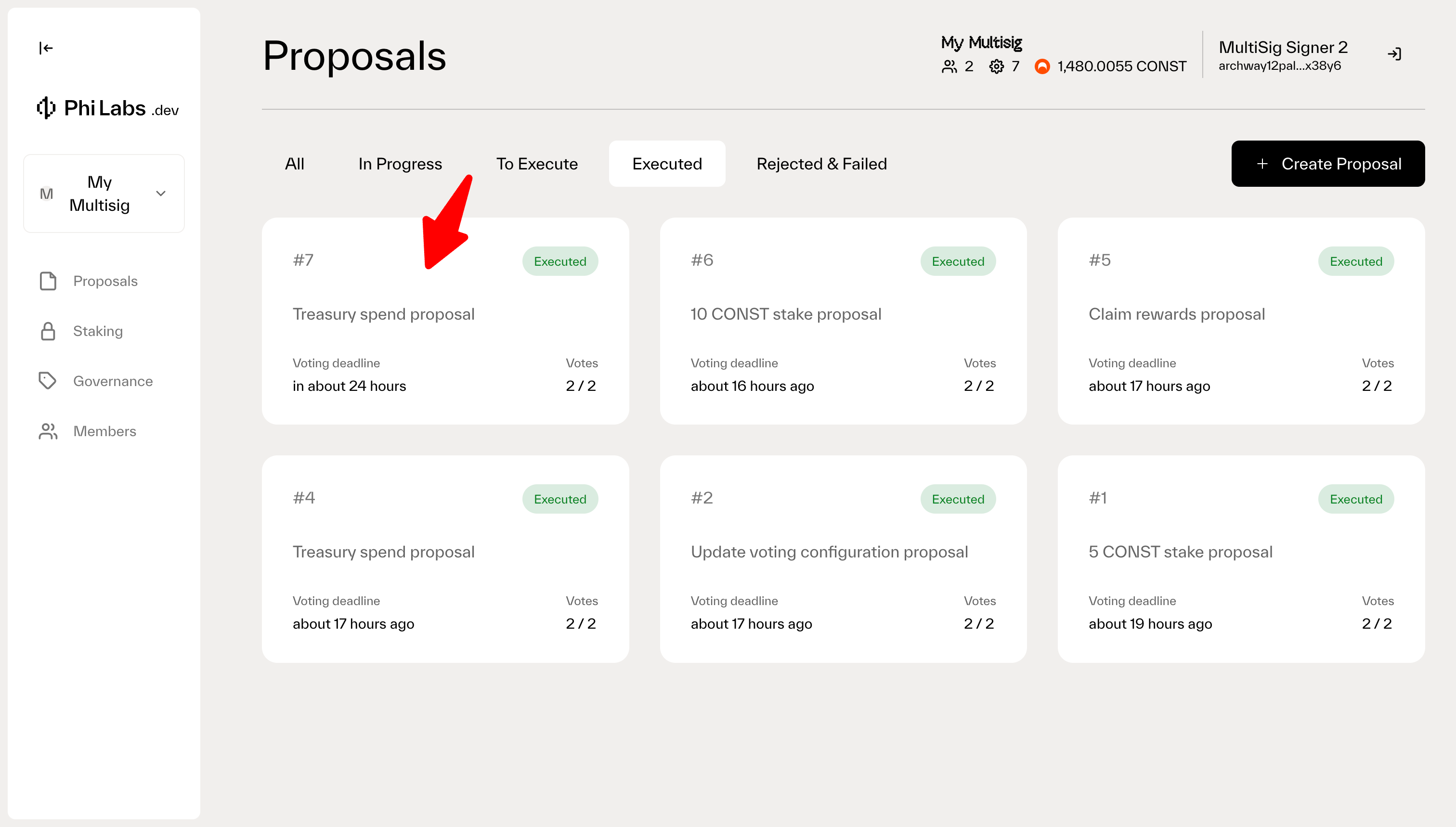 As an example let's execute a Treasury Spend proposal. Make sure to send some ARCH or CONST tokens to the Multisig account. You can find the multisig account address by clicking the drop down menu in the left navigation bar and clicking on the address to copy it.