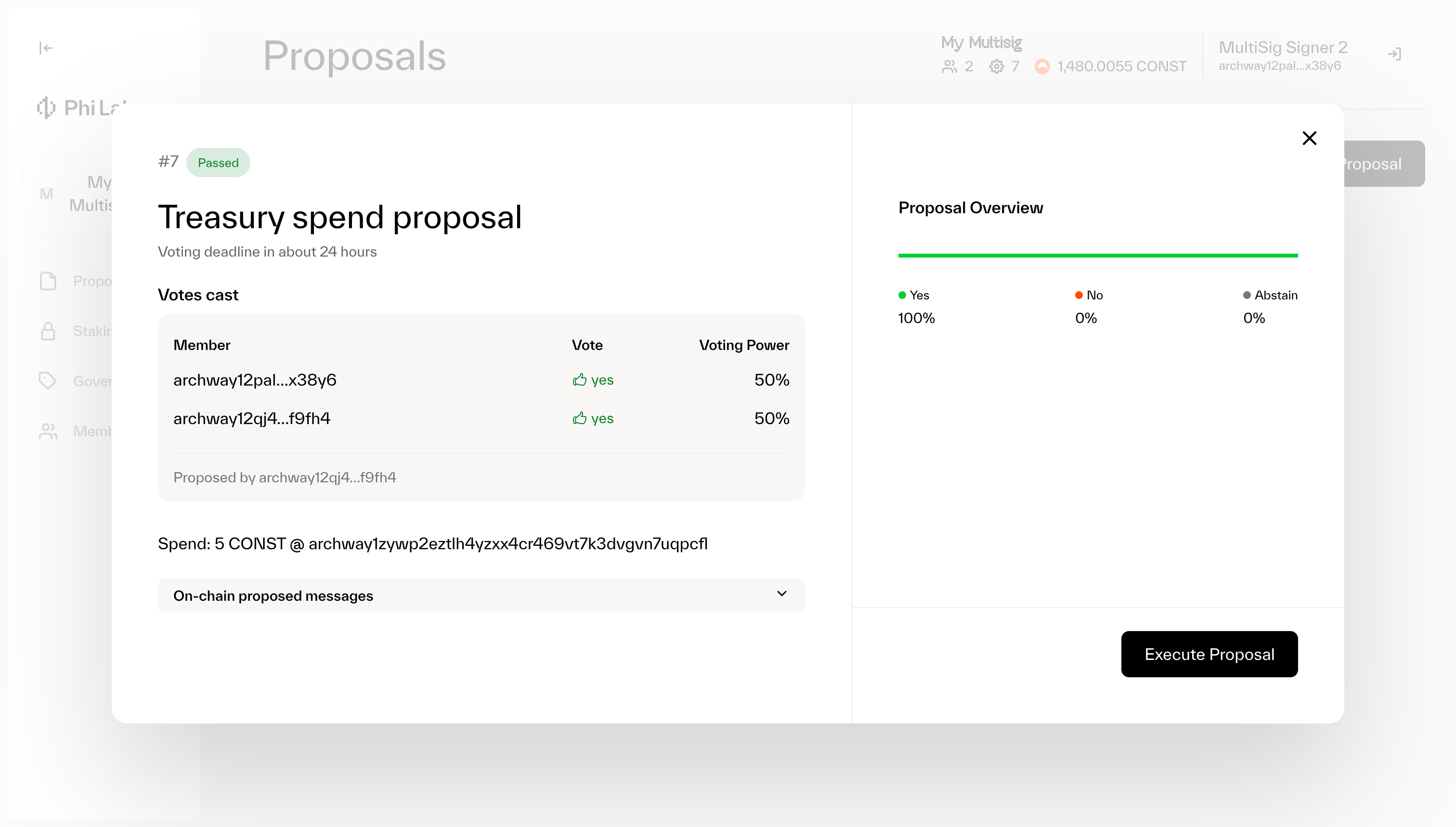 Once the proposal is approved it will be ready to be executed. It should show up under the "To Execute" tab. Click on the proposal and click the "Execute Proposal" button to complete the transaction.