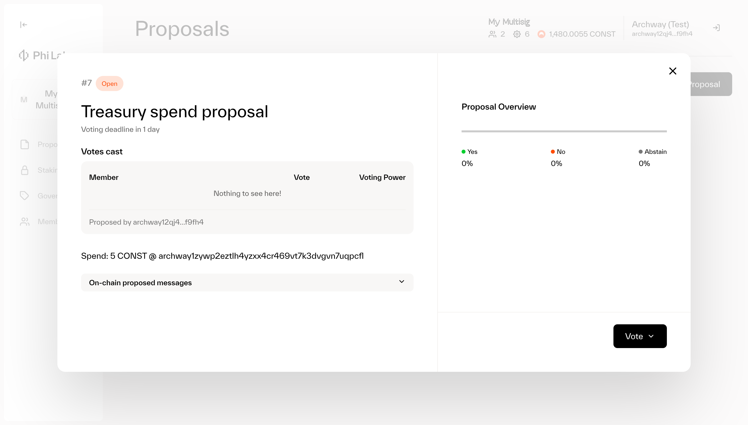The governance page lists all governance proposals created on the Archway blockchain. It allows the multisig account to vote on these governance proposals. If you see a governance proposal that’s still active you can click on the governance proposal and select a vote (Yes, No, Abstain, No with veto) which will generate a multisig proposal for members to vote on. If the multisig proposal is approved the vote made on the governance proposal will be submitted on chain.