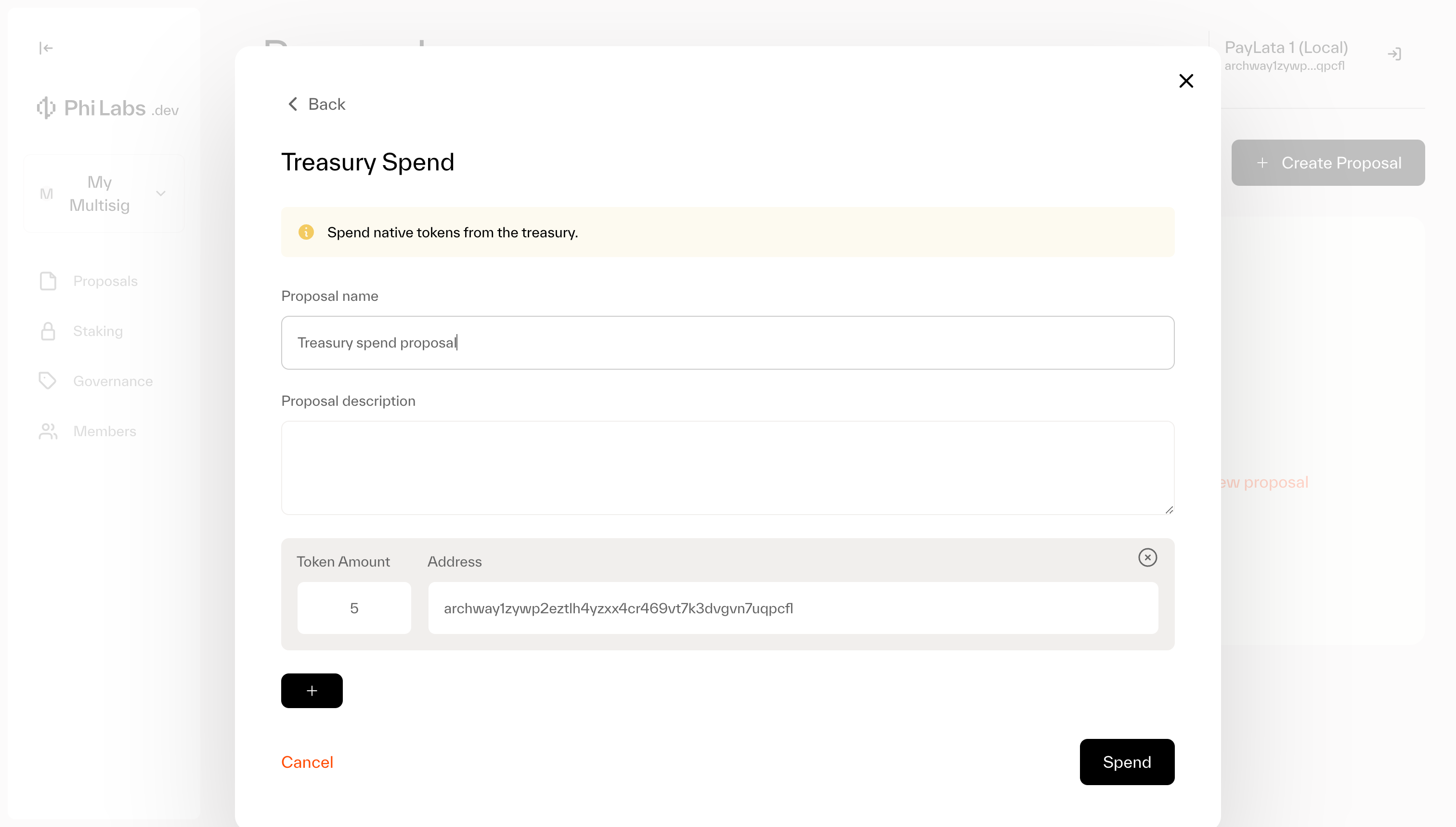 - Treasury Spend: The treasury spend proposal allows for sending native tokens from the Multisig account to another account.